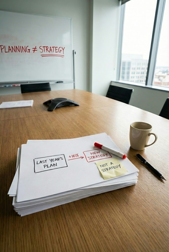 Last-year-plus planning happens when planning gets mistaken for strategy. Instead of examining internal realities, market shifts, and what’s actually unfolding, last year’s plan gets lifted, adjusted, and presented as strategic direction.